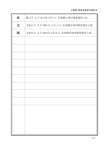 江都堂·澄派廷玺桧亨庭发支 跃 俊之子,生于2010年6月2日,住仙桃市剅河镇夏场村六组 贞 才新长女,生于2003年11月11日,住仙桃市剅河镇夏场村六组 栖 才新次女,生于2010年4月15日,住仙桃市剅河镇夏场村六组 · 1125 ·