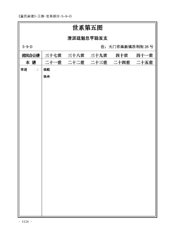 《董氏宗谱》·三修·世系部分·5-9-D 世系第五图 澄派廷魁忽亨聪发支 5-9-D 住:天门市渔新镇胜利街 26 号 流坑合公谱 三十七世 三十八世 三十九世 四十世 四十一世 本 谱 二十一世 二十二世 二十三世 二十四世 二十五世 萃进 二 子 临航 临舟 · 1126 · -1-