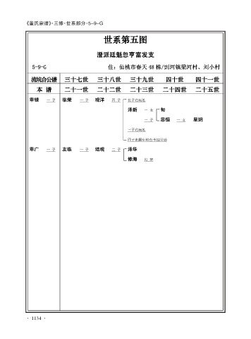 《董氏宗谱》·三修·世系部分·5-9-G 世系第五图 澄派廷魁忽亨富发支 5-9-G 住:仙桃市春天 48 栋/剅河镇梁河村、刘小村 流坑合公谱 三十七世 三十八世 三十九世 四十世 四十一世 本 谱 二十一世 二十二世 二十三世 二十四世 二十五世 萃银 一 子 临荣 一 子 观洋 四 子 长子归杨姓 泽新 一 女 旬 一 子 思恒 一 女 星玥 三子归杨姓 四子出嗣中岭台萃廷曾孙 萃广 一 子 友临 一 子 培观 二 子 泽华 修海 归 宗 · 1134 · -1-