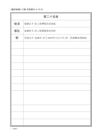 《董氏宗谱》·三修·世系部分·5-10-E 第二十五世 佳文 复德长子,住三伏潭镇苏湾四组 佳礼 复德次子,住三伏潭镇苏湾四组 轩 军涛之子,名涵宇,生于2010年2月17日,住三伏潭镇苏湾四组 · 1182 ·