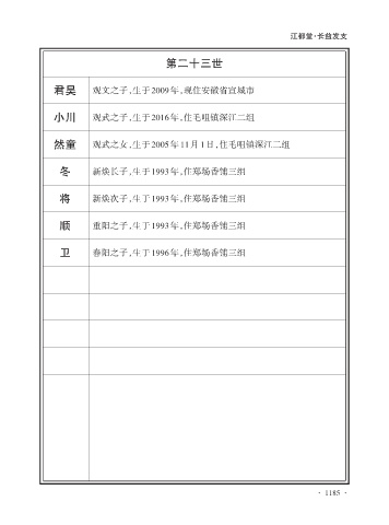 江都堂·长益发支 第二十三世 君昊 观文之子,生于2009年,现住安徽省宣城市 小川 观武之子,生于2016年,住毛咀镇深江二组 然童 观武之女,生于2005年11月1日,住毛咀镇深江二组 冬 新焕长子,生于1993年,住郑场香铺三组 将 新焕次子,生于1993年,住郑场香铺三组 顺 重阳之子,生于1993年,住郑场香铺三组 卫 春阳之子,生于1996年,住郑场香铺三组 · 1185 ·