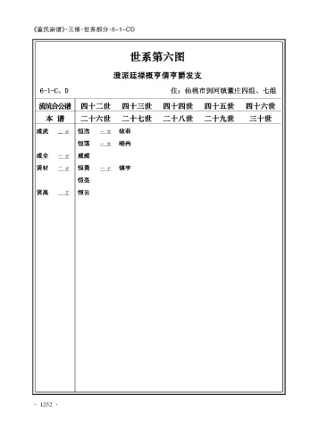 《董氏宗谱》·三修·世系部分·6-1-CD 世系第六图 澄派廷禄概亨倩亨爵发支 6-1-C、D 住:仙桃市剅河镇董庄四组、七组 流坑合公谱 四十二世 四十三世 四十四世 四十五世 四十六世 本 谱 二十六世 二十七世 二十八世 二十九世 三十世 咸武 二 子 恒浩 一 女 依菲 恒荡 一 女 晓冉 咸全 一 子 威威 贤材 二 子 恒勇 一 子 镇宇 恒亮 贤高 一 子 恒云 -2- · 1252 ·