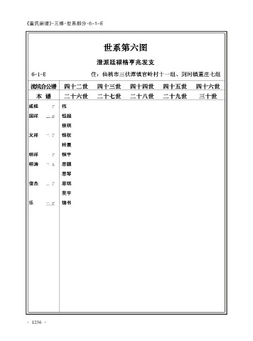 《董氏宗谱》·三修·世系部分·6-1-E 世系第六图 澄派廷禄格亨兆发支 6-1-E 住:仙桃市三伏潭镇官岭村十一组、剅河镇董庄七组 流坑合公谱 四十二世 四十三世 四十四世 四十五世 四十六世 本 谱 二十六世 二十七世 二十八世 二十九世 三十世 咸桂 一 子 伟 国祥 二 子 恒超 佳琪 义祥 二 子 恒权 梓晨 明祥 一 子 恒宇 明涛 二 女 思颖 思琴 俊杰 二 子 思琪 昊宇 乐 一 子 锦书 -1- · 1256 ·
