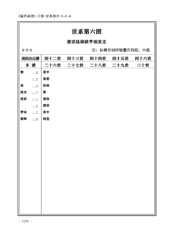 《董氏宗谱》·三修·世系部分·6-2-A 世系第六图 澄派廷禄梯亨相发支 6-2-A 住:仙桃市剅河镇董庄四组、六组 流坑合公谱 四十二世 四十三世 四十四世 四十五世 四十六世 本 谱 二十六世 二十七世 二十八世 二十九世 三十世 黎 一 女 羡宇 一 子 羡星 苗 一 女 依依 咸文 一 子 衡 咸武 一 子 俊辰 一 女 雅思 梦来 一 子 宵宇 黎辉 一 女 相宜 -1- · 1258 ·