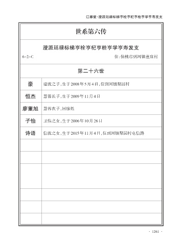 江都堂·澄派廷禄标梯亨栓亨杞亨桂亨学亨寿发支 世系第六传 澄派廷禄标梯亨栓亨杞亨桂亨学亨寿发支 6-2-C 住:仙桃市剅河镇董庄村 第二十六世 豪 建波之子,生于2008年5月4日,住剅河镇梨园村 恒杰 慧蓉长子,生于2009年11月4日 廖董旭 慧蓉次子,回廖姓 子怡 卫伟之女,生于2006年10月26日 诗语 信波之女,生于2015年11月4日,住剅河镇梨园村电信路 · 1261 ·