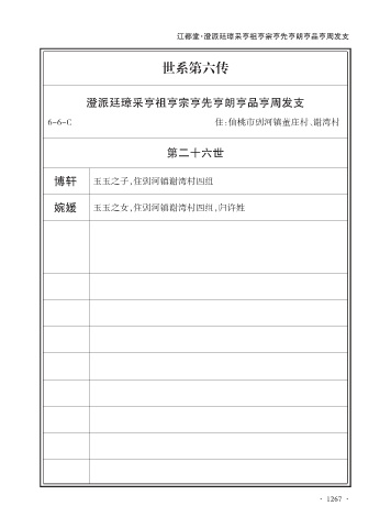 江都堂·澄派廷璋采亨祖亨宗亨先亨朗亨品亨周发支 世系第六传 澄派廷璋采亨祖亨宗亨先亨朗亨品亨周发支 6-6-C 住:仙桃市剅河镇董庄村、谢湾村 第二十六世 博轩 玉玉之子,住剅河镇谢湾村四组 婉媛 玉玉之女,住剅河镇谢湾村四组,归许姓 · 1267 ·