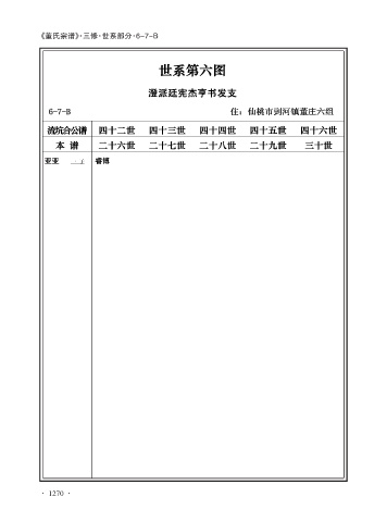 《董氏宗谱》·三修·世系部分·6-7-B 世系第六图 澄派廷宪杰亨书发支 6-7-B 住:仙桃市剅河镇董庄六组 流坑合公谱 四十二世 四十三世 四十四世 四十五世 四十六世 本 谱 二十六世 二十七世 二十八世 二十九世 三十世 亚亚 一 子 睿博 -1- · 1270 ·