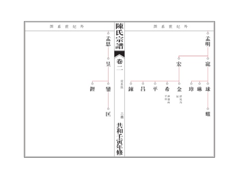 陳氏宗譜 图 系 世 纪 外 图 系 世 纪 外 〇〇〇 孟明 〇〇〇 孟恩 〇 〇 卷二 〇〇〇 宏 〇〇〇 昱 〇〇〇 寵 〇 〇 〇 世系图 〇〇〇 希 〇〇〇 平 〇〇〇 琳 〇〇〇 球 〇〇〇 金 〇〇〇 璋 〇〇〇 鏗 〇〇〇 鑾 〇〇〇 錬 〇〇〇 昌 〇 〇 〇 〇 〇 〇 〇 〇 〇 〇 詳見內 葬塘齊 平浴 紀 〇〇〇 耀 〇〇〇 匡 〇 〇 二四 共和壬寅年修
