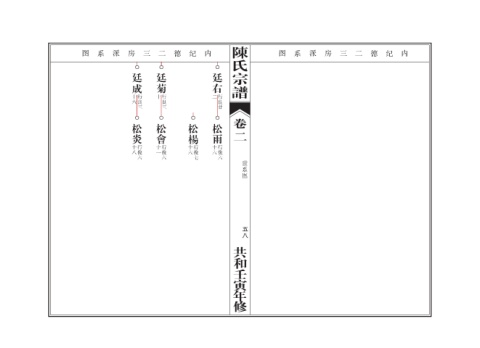 陳氏宗譜 图 系 派 房 三 二 德 纪 内 图 系 派 房 三 二 德 纪 内 〇〇〇 廷菊 〇〇〇 廷成 〇〇〇 廷右 〇 〇 〇 十六 行良三 十 行良三 二 行良廿 卷二 〇〇〇 松楊 〇〇〇 松雨 〇〇〇 松炎 〇〇〇 松會 〇 〇 〇 〇 十八 行俊六 十一 行俊六 十六 行俊七 十六 行俊六 世系图 五八 共和壬寅年修
