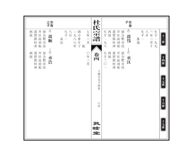 杜氏 立子 世青 子 世春 西组 道贾郢村冲 开区高刘街 居合肥市经 生子一 八月 一九八八年 周小非生于 七年三月 宗谱 生于一九八 西组 道贾郢村冲 开区高刘街 居合肥市经 生子一 八日 三年三月十 生于一九九 啟顺 啟伟 十三世 承汉 聂尧 配 西组 道贾郢村冲 开区高刘街 居合肥市经 〇年三月 卷四 生于二〇一 西组 道贾郢村冲 开区高刘街 居合肥市经 承浩 承汉 十四世 士诲公支下世系 十五世 十六世 一〇 敦睦堂 十七世