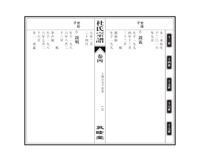 杜氏 子 世松 子 世保 女一 十六日 六年七月二 生于一九八 李卢娟 十三日 六年八月二 生于一九八 二十四日 七年二月 宗谱 生于一九九 陈盼盼 二十二日 四年十二月 生于一九九 年九月 于二〇一六 女一承辰生 啟明 啟霖 十三世 承蕊 配 配 卷四 十四世 士诲公支下世系 十五世 十六世 一三 敦睦堂 十七世