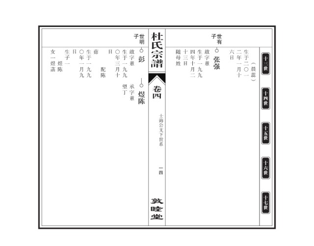 杜氏 子 世明 子 世有 女一煜菡 生子一 日 〇年一月九 生于一九九 茹 日 〇年三月十 生于一九九 啟字輩 宗谱 随母姓 十三日 四年十月二 生于一九九 啟字輩 六日 二年一月十 生于二〇一 彭 张强 十三世 煜陈 (晨蕊) 配 陈 望丁 承字輩 卷四 煜陈 十四世 士诲公支下世系 十五世 十六世 一四 敦睦堂 十七世