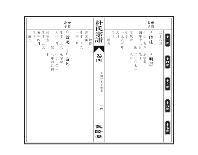 杜氏 次子 世育 长子 世育 生子一 五年四月 生于一九九 谈祖莹 六年三月 生于一九八 一年二月 生于一九九 唐文涵 宗谱 生子一 六月 一九八五年 生于 王凤叶 四年十二月 生于一九八 二十八日 谊凡 啟龙 啟柱 十三世 续配 明杰 配 配 七 七年四月初 生于二〇一 承字辈 卷四 八月 二〇〇七年 生于 承字辈 谊凡 明杰 十四世 士诲公支下世系 十五世 十六世 一六 敦睦堂 十七世