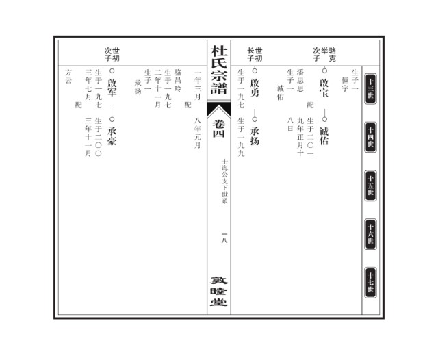 杜氏 次子 世初 长子 世初 次子 举 骆克 方云 三年七月 生于一九七 生子一 二年十一月 生于一九七 骆昌玲 一年三月 宗谱 生于一九七 生子一 潘思思 生子一 啟军 承扬 啟勇 啟宝 恒宇 十三世 诚佑 配 配 配 三年十一月 生于二〇〇 八年元月 卷四 生于一九九 八日 九年正月十 生于二〇一 承豪 承扬 诚佑 十四世 士诲公支下世系 十五世 十六世 一八 敦睦堂 十七世