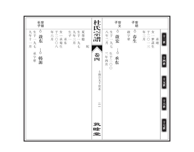杜氏 长子 世银 子 世文 子 世明 九年十一月 生于一九七 年六月 于二〇〇八 女一承菊生 生子一 九年三月 生于一九七 夏帮聪 宗谱 八年二月 生于一九七 啟字辈 年三月 于二〇一三 女一梦菡生 啟东 啟宏 春生 十三世 承东 承靖 配 承字辈 卷四 三年四月 生于二〇〇 韩源 承东 十四世 士诲公支下世系 十五世 十六世 二一 敦睦堂 十七世