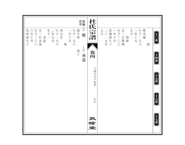 杜氏 次子 世银 次欣蓓生于 六年十月 生于二〇〇 女二长美瑶 生子一 二年九月 生于一九八 周宗芳 一年十月 生于一九八 啟字辈 宗谱 七月 二〇一五年 次馨悦生于 一年十月 生于二〇〇 女二长萌萌 生子一 一年十月 生于一九八 韩光菊 维 十三世 承意 韩源 配 配 望丁 卷四 承意 十四世 士诲公支下世系 十五世 十六世 二二 敦睦堂 十七世