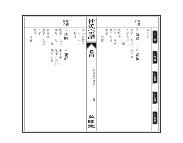 杜氏 长子 世甫 子 世源 生子一 五年 生于一九七 吴艳霞 四年三月 生于一九七 年九月 于二〇一六 女一若依生 宗谱 生子一 九年八月 生于一九八 钱昌洁 九年七月 生于一九八 年三月 啟明 啟遥 十三世 亚轩 亚依 配 配 四年五月 生于二〇〇 承字辈 卷四 承字辈 亚轩 亚依 十四世 士诲公支下世系 十五世 十六世 二四 敦睦堂 十七世