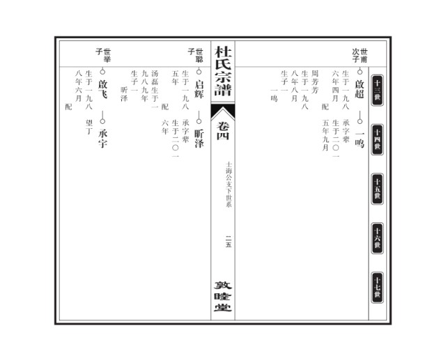 杜氏 子 世举 子 世聪 次子 世甫 八年六月 生于一九八 生子一 九八九年 汤磊生于一 五年 生于一九八 宗谱 生子一 八年八月 生于一九八 周芳芳 六年四月 生于一九八 啟飞 启辉 啟超 十三世 昕泽 一鸣 配 配 配 望丁 六年 生于二〇一 承字辈 卷四 五年九月 生于二〇一 承字辈 承宇 昕泽 一鸣 十四世 士诲公支下世系 十五世 十六世 二五 敦睦堂 十七世