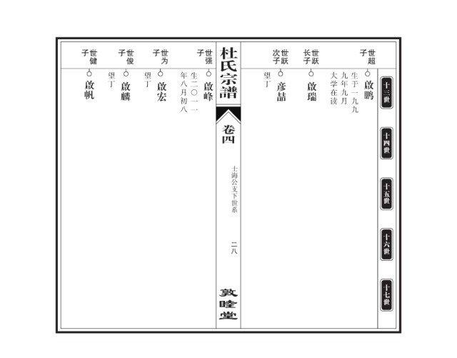 杜氏 子 世健 子 世俊 子 世为 子 世强 次子 世跃 长子 世跃 子 世超 望丁 望丁 年八月初八 生二〇一一 宗谱 望丁 大学在读 九年九月 生于一九九 啟帆 啟宏 啟峰 啟瑞 啟鹏 十三世 彦喆 啟麟 卷四 十四世 士诲公支下世系 十五世 十六世 二八 敦睦堂 十七世