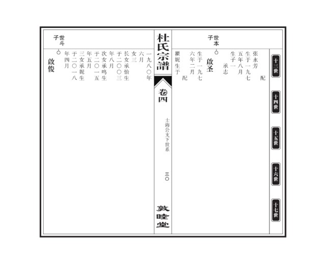杜氏 子 世斗 子 世本 年四月 于二〇一八 三女承妮生 年五月 于二〇一五 次女承鸣生 年八月 于二〇〇三 长女承怡生 女三 六月 一九八〇年 宗谱 瞿妮生于 六年二月 生于一九七 生子一 五年八月 生于一九七 张永芳 啟圣 啟俊 十三世 承志 配 配 卷四 十四世 士诲公支下世系 十五世 十六世 三〇 敦睦堂 十七世
