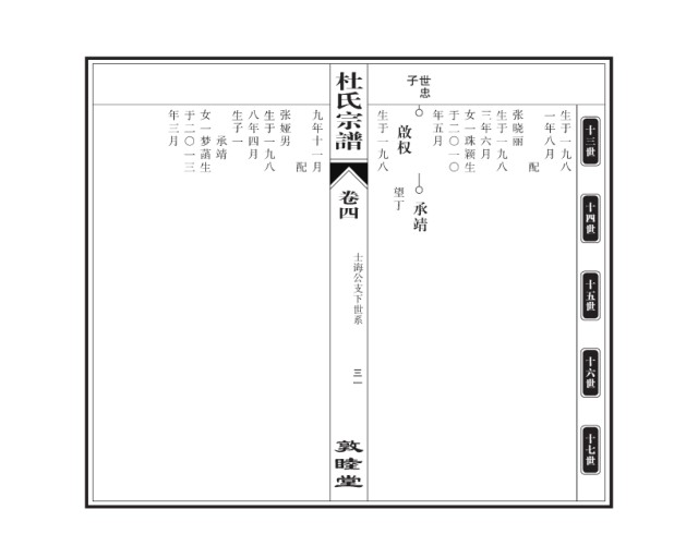 杜氏 子 世忠 年三月 于二〇一三 女一梦菡生 生子一 八年四月 生于一九八 张娅男 九年十一月 宗谱 生于一九八 年五月 于二〇一〇 女一珠颖生 三年六月 生于一九八 张晓丽 一年八月 生于一九八 啟权 十三世 承靖 配 配 卷四 望丁 承靖 十四世 士诲公支下世系 十五世 十六世 三一 敦睦堂 十七世