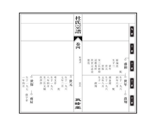 杜氏 宗谱 九 世 卷四 十 世 补遗录 恕亮 次世云适余 适程龙壮 女二长世珍 生子三 徐瑞连 盛和 十一世 世保 世元 世年 配 一年四月 生于一九七 次萍萍 女二长文娟 八年四月 生于一九六 邓支芹 七年二月 生于一九六 生子一 五年八月 生于一九六 胡金霞 四年六月 生于一九六 世保 世元 世年 十二世 三三 啟翔 配 配 啟字辈 雨辰 敦睦堂 啟翔 十三世