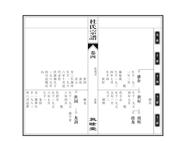 杜氏 宗谱 九 世 卷四 十 世 补遗录 山 四月适陶应 一九六九年 次康梅生于 代永传 六年十月适 生于一九六 女二长康玲 生子四 四年七月 生于一九三 康保英 一年三月 生于一九三 盛余 十一世 世云 世伦 世国 世好 配 年六月适曹 于一九八三 女一康翠生 生子一 八年七月 生于一九五 孔祥芝 六年四月 生于一九五 生子二 五年二月 生于一九五 孔令志 四年七月 生于一九五 世国 世好 十二世 龙剑 啟龙 三五 啟辉 啟兵 配 配 啟字辈 龙剑 敦睦堂 啟龙 啟辉 十三世