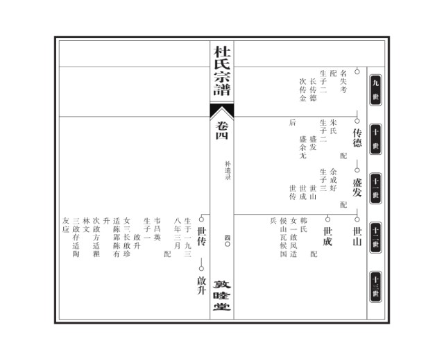 杜氏 宗谱 生子二 配 名失考 次传金 长传德 九 世 卷四 后 生子二 朱氏 传德 十 盛 盛发 余 世 无 配 补遗录 生子三 余成好 盛发 十一世 世传 世成 世山 配 友应 三啟存适陶 林文 次啟方适瞿 升 适陈郢陈有 女三长啟珍 生子一 韦昌英 八年三月 生于一九三 兵 侯山瓦候国 女一啟凤适 韩氏 世传 世成 世山 十二世 啟升 四〇 配 配 啟升 敦睦堂 十三世