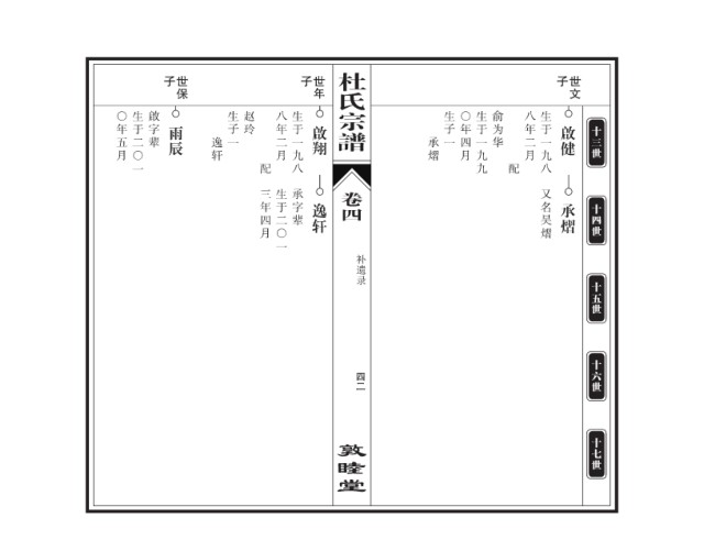 杜氏 子 世保 子 世年 子 世文 〇年五月 生于二〇一 啟字辈 生子一 赵玲 八年二月 生于一九八 宗谱 生子一 〇年四月 生于一九九 俞为华 八年二月 生于一九八 雨辰 啟翔 啟健 十三世 逸轩 承熠 配 配 三年四月 生于二〇一 承字辈 卷四 又名昊熠 逸轩 承熠 十四世 补遗录 十五世 十六世 四二 敦睦堂 十七世