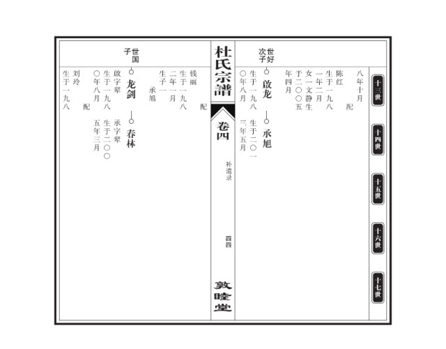 杜氏 子 世国 次子 世好 生于一九八 刘玲 〇年八月 生于一九八 啟字辈 生子一 二年一月 生于一九八 钱丽 宗谱 〇年八月 生于一九八 年四月 于二〇〇五 女一文静生 一年二月 生于一九八 陈红 八年十月 龙剑 啟龙 十三世 承旭 配 配 配 五年三月 生于二〇〇 承字辈 卷四 三年五月 生于二〇一 春林 承旭 十四世 补遗录 十五世 十六世 四四 敦睦堂 十七世