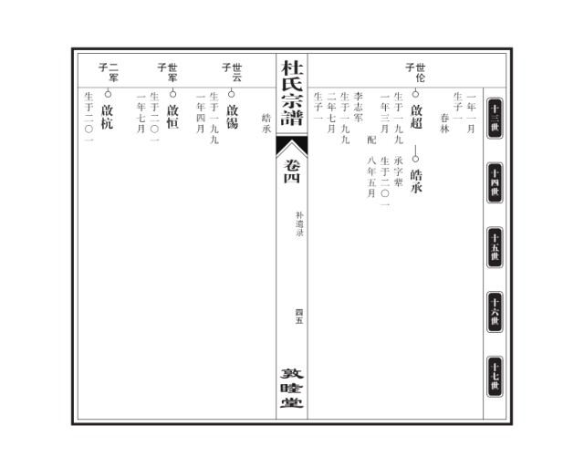 杜氏 子 二军 子 世军 子 世云 子 世伦 生于二〇一 一年七月 生于二〇一 一年四月 生于一九九 宗谱 生子一 二年七月 生于一九九 李志军 一年三月 生于一九九 生子一 一年一月 啟杭 啟恒 啟锡 啟超 十三世 皓承 春林 配 卷四 八年五月 生于二〇一 承字辈 皓承 十四世 补遗录 十五世 十六世 四五 敦睦堂 十七世