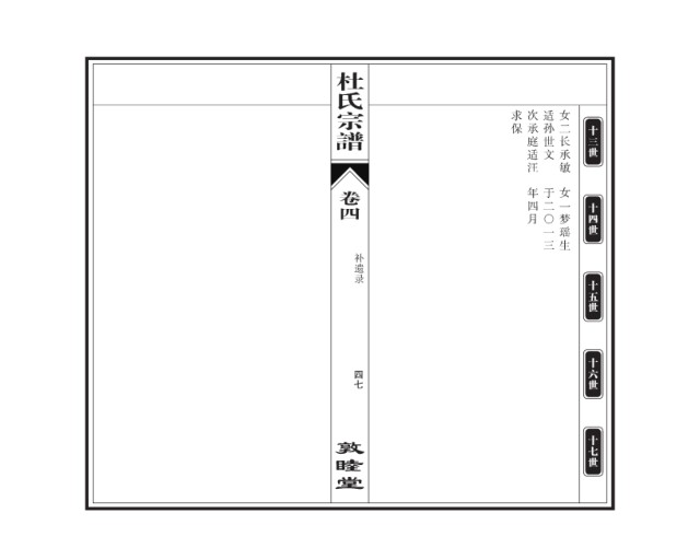 杜氏 宗谱 求保 次承庭适汪 适孙世文 女二长承敏 十三世 卷四 年四月 于二〇一三 女一梦瑶生 十四世 补遗录 十五世 十六世 四七 敦睦堂 十七世