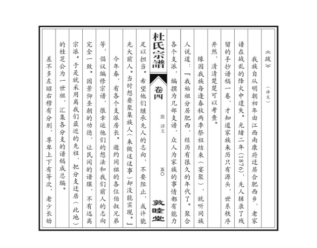 的桂芝公为一世祖,汇集各分支的谱稿成总编。 宗派。于是就采用离我们最近的先祖,把分支迁居(此地) 完全一致。因景仰圣朝的功德,让民间的谱牒,不有远离 等,倡议编修宗谱,很幸运他们的想法和我们前人的志向 光大前人。当时想要聚集族人(来做这这事)却没能实现。』 足以担当。希望他们继承先人的志向,不要阻止,或许能 各个支派,编撰为几部支谱,众人为家族的事情都有能力 人说道:『我始祖分居肥西,经历有很久的年代了。聚合 井然,清清楚楚可以考查。 留的手抄谱稿一卷,才知道家族来历只有源头,世系秩序 谱在战乱的烽火中遗失。光绪二年
