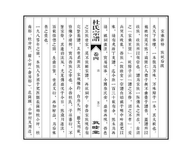 南郢、杜冲西、韩小圩(仓房郢)、北岗头、公和村及周近, 一九八零年之前,本族人多居于肥西县 者之责也。 百载倥偬之 坠家声,其遗韵流风,尤足传盛况于今日。然 皆条分缕析,实为吾族之幸也。今吾杜氏,子 完整 之巨族世家,莫不竞 續 来, 兵燹及政乱,吾族(敦睦堂)宗 之『家乘至宝』,欧阳子云『 收族,收族所以敬宗也。 他姓何莫不然?窃闻仁人君子无不垂青于 夫天下事理,一本散为万殊,万殊归于一本,其大较也。