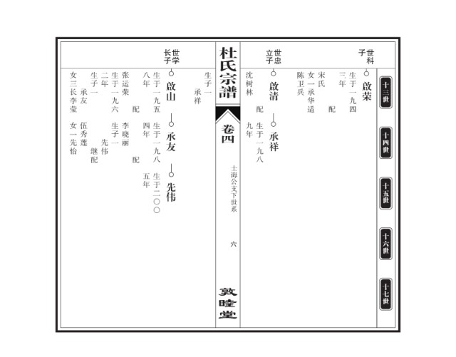 杜氏 长子 世学 立子 世忠 子 世科 女三长李莹 生子一 二年 生于一九六 张运荣 八年 生于一九五 生子一 宗谱 沈树林 陈卫兵 女一承华适 宋氏 三年 生于一九四 啟山 啟清 啟荣 十三世 承友 承祥 配 配 配 女一先怡 伍秀莲 生子一 李晓丽 四年 生于一九八 卷四 九年 生于一九八 承友 承祥 十四世 先伟 继 配 配 士诲公支下世系 五年 生于二〇〇 先伟 十五世 十六世 六 敦睦堂 十七世
