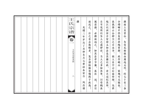 ൦ሷ௶ 撰 而近之,后之有志敦睦者,览吾谱叙能勿惕然于此哉! 属苗裔,必推而远之,如其忠孝节廉,虽在 自耳究所以为人之道即在,当人之身如其卑,污苟贱虽 起江以西居吉安府太和县是其籍以此,亦不过纪其所, 虽我登云公辞尘之日未书,祖人名字示后而传闻,先世 分缕晰中仍复丝牵绳贯据,此作岷山 推而上至晋公,为受氏始祖由周迄元代,经七十有三条 光绪三年岁次丁丑仲冬月七世孙永安仝 卷一 王氏本宗世系叙 镕 冢观可无疑也, 八 镕 镕 远,必引 凤昌谨