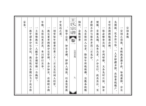 一族中诸务分长会议,族长处决务期公当于众不得 一主祭惟族长一人献毕余循昭穆一仝跪叩。 一族长董率阁族分长管理,各分如实,在称职不拘 一祠堂每年需香灯费三千二百文交住祠人经管。 ,祭毕公算,如有余剩,即择人领放,以备奖赏族 一凡有祭田入公者,除每年所收租棵,完敷春秋粮 一祭必整食衣冠,序列昭穆,又各先时只侯,如有 一宗祠之设敦,本睦族悉籍乎此,每逢霜降,分长 宗祠条规