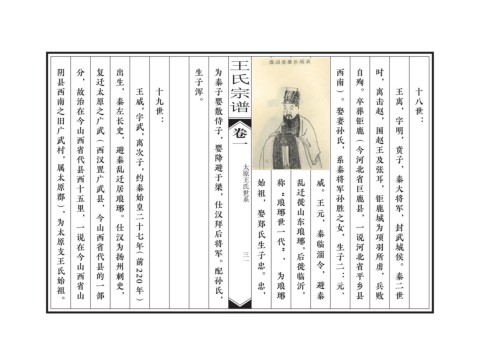 阴县西南之旧广武村,属太原郡),为太原支王氏始祖。 分,故治在今山西省代县西十五里,一说在今山西省山 复迁太原之广武(西汉置广武县,今山西省代县的一部 出生,秦左长史,避秦乱迁居琅琊。仕汉为扬州刺史, 生子浑。 为秦子婴散侍子,婴降避于梁,仕汉拜后将军。配孙氏, 西南)。娶妻孙氏,系秦将军孙胜之女,生子二:元、 自殉。卒葬钜鹿(今河北省巨鹿县,一说河北省平乡县 时,离击赵,围赵王及张耳,钜鹿城为项羽所虏,兵败