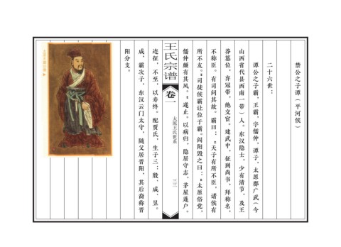 谭公之子霸,王霸,字儒仲,谭子,太原郡广武(今 二十六世: 禁公之子谭(平河侯)