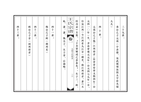 ൦ሷ௶ 虬、蜚。蜚,焕次子,生子章,后裔略。 经决录》五篇, 仕宋江州(今江西省九江市)剌史,称江州府君。著《五 元四一 大夫) 四十三世: 蚪公之子音(同州府君) 四十二世: 焕公之子蚪(荆州史) 四十一世: 元谟公之子焕(江州府君)东晋晋安帝义熙四年(公 四 秀公之子元谟(字彦德,宋武朝领汝阴太守补光禄 三十九世: 〇 十 年)生,齐高帝建元元年(公元四七九年)卒。 世: 卷一 言圣贤制述之意备矣 “ 太原王氏世系 三六 ” 。生子三:蚪、