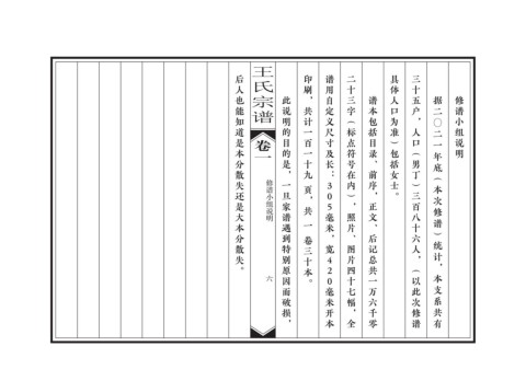 ൦ሷ௶ 后人也能知道是本分散失还是大本分散失。 印刷,共计一百一十九 谱用自定义尺寸及长:305毫米,宽420毫米开本 二十三字(标点符号在内),照片、图片四十七幅,全 具体人口为准)包括女士。 三十五户,人口(男丁)三百八十六人,(以此次修谱 此说明的目的是,一旦家谱遇到特别原因而破损, 谱本包括目录、前序,正文、后记总共一万六千零 据二 修谱小组说明 〇 二一年底(本次修谱)统计,本支系共有 卷一 修谱小组说明 页,共 一 卷三十本。 六