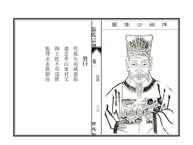 张氏宗谱 圖 像 公 始 揮 作弧矢而威寰區 振聲名永欽制度 錫土姓不負謀猷 盡忠孝以事君父 贊曰 卷一 像圖 八五 百忍堂