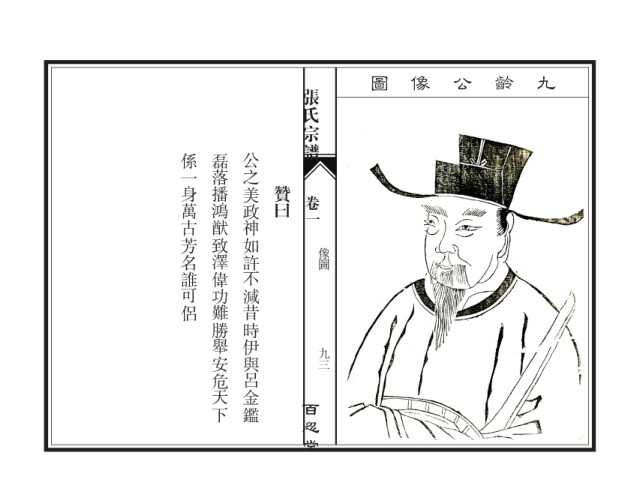 张氏宗谱 圖 像 公 齡 九 係一身萬古芳名誰可侶 磊落播鴻猷致澤偉功難勝舉安危天下 公之美政神如許不減昔時伊與呂金鑑 贊曰 卷一 像圖 九三 百忍堂