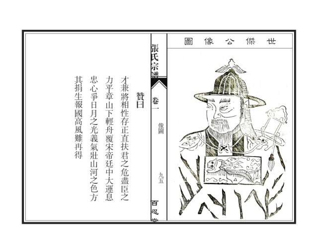 张氏宗谱 圖 像 公 傑 世 才兼將相性存正直扶君之危盡臣之 力平章山下輕舟覆宋帝廷中大運息 其捐生報國高風難再得 忠心爭日月之光義氣壯山河之色方 贊曰 卷一 像圖 九五 百忍堂