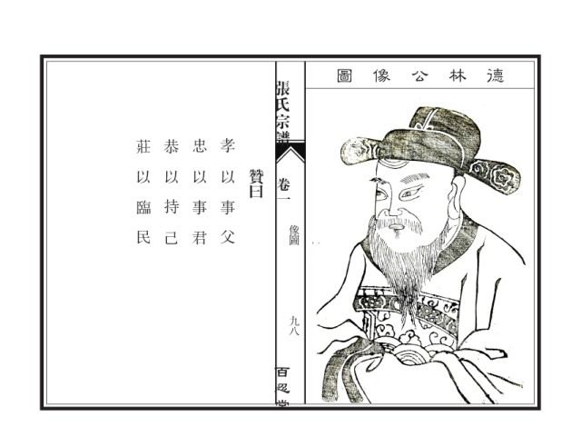 张氏宗谱 圖 像 公 林 德 忠 孝 恭 莊 以 以 以 以 贊曰 卷一 事 事 臨 持 己 民 父 君 像圖 九八 百忍堂
