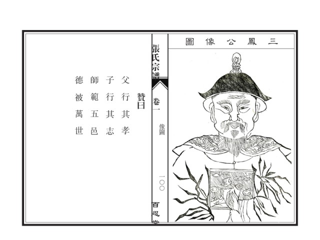 张氏宗谱 圖 像 公 鳳 三 子 父 師 德 行 行 範 被 贊曰 卷一 其 其 萬 五 邑 世 孝 志 像圖 一〇〇 百忍堂