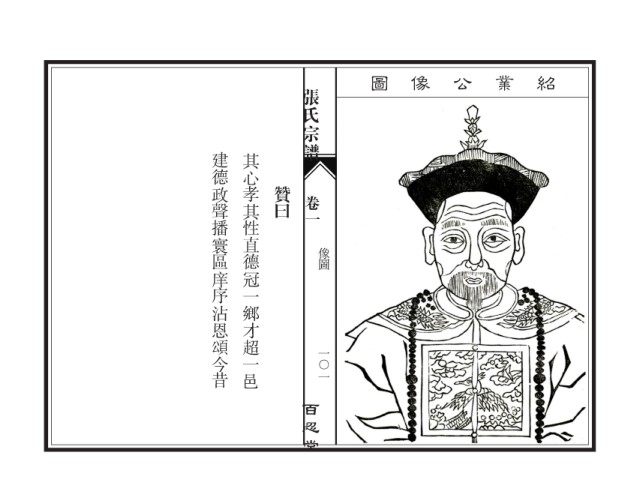 张氏宗谱 圖 像 公 業 紹 建德政聲播寰區庠序沾恩頌今昔 其心孝其性直德冠一鄉才超一邑 贊曰 卷一 像圖 一〇一 百忍堂