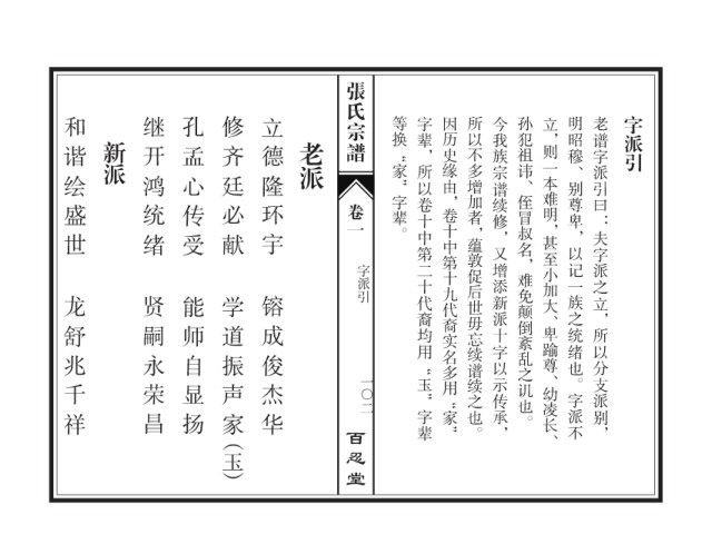 和谐绘盛世 继开鸿统绪 孔孟心传受 修齐廷必献 立德隆环宇 等换 字辈,所以卷十中第二十代裔均用 因历史缘由,卷十中第十九代裔实名多用 所以不多增加者,蕴敦促后世毋忘续谱续之也。 今我族宗谱续修,又增添新派十字以示传承, 孙犯祖讳、侄冒叔名,难免颠倒紊乱之讥也。 立,则一本难明,甚至小加大、卑踰尊、幼凌长、 明昭穆、别尊卑,以记一族之统绪也。字派不 老谱字派引曰:夫字派之立,所以分支派别, 字派引