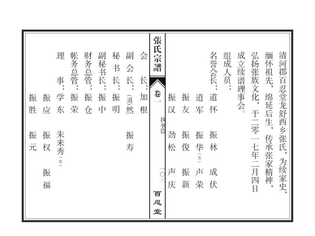 张氏宗谱 理 帐务总管:振 财务总管:振 副秘书长:振 秘 副 会 名誉会长:道 组成人员: 成立续谱理事会。 弘扬张族文化,于二零一七年二月四日 缅怀祖先,绵延后生,传承张家精神, 清河郡百忍堂龙舒西乡张氏,为续家史, 书 会 长: 长:振 事:学 长:加 振 振 卷一 振 振 道 ( 道 仓 中 荣 怀 根 明 友 汉 东 应 军 然 胜 ) 执事篇 振 振 朱来秀 振 劲 振 振 振 林 俊 松 华 寿 权 元 (女) (女) 振 一〇三 声 振 声 成 伏 庆 新 荣 福 百忍堂
