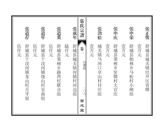 张氏宗谱 张道存 张道年 张道炎 张成年 张劲松 张申庆 张申荣 张正俊 城关镇马河口卓山村付庄组 壹万元 舒城县城关镇河镇村河边组 壹万元 壹万元 舒城县城关镇经开区青墩 舒城县柏林乡马松村小闸组 舒城县棠树乡窑墩村大官庄 壹万元 陆仟元 舒城县干汊河镇绕山村安南组 伍仟元 伍仟元 伍仟元 舒城县干汊河镇龙山村月牙组 舒城县棠树乡路西村联合组 卷一 功德篇 一〇六 百忍堂